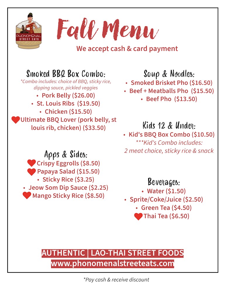 Explore our food truck, where we serve delicious Lao-Thai Craft BBQ and mouthwatering street foods. Craving our BBQ Box, Pho, or more? We've got you covered!